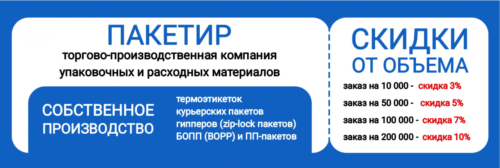 Компания «Пакетир» специализируется на производстве и продаже упаковки для различных сфер бизнеса. Мы предоставляем широкий ассортимент товаров: от упаковки для маркетплейсов и магазинов до специализированной упаковки для пищевой промышленности и производственных предприятий. Работая с 2019 года, мы заслужили доверие тысяч клиентов из Москвы, Санкт-Петербурга и других регионов России.